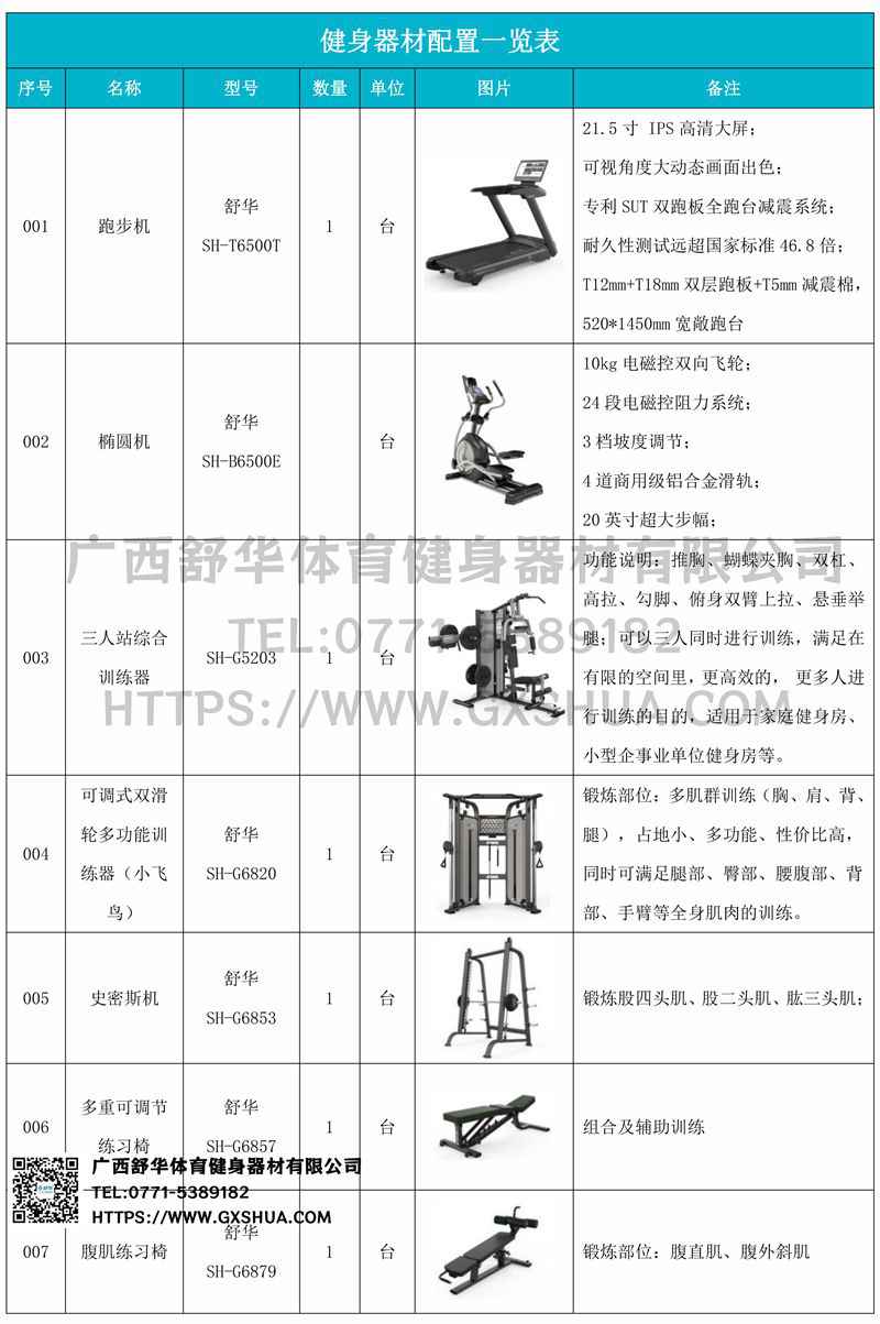小飞鸟(1台)、史密斯机(1台)、多重可调节练习椅(1台)、腹肌板(1台)、10付哑铃套组(1套)、哑铃凳(1台),可以实现对不同肌肉群的针对性训练,满足肌肉训练需求,全方位激活身体机能。